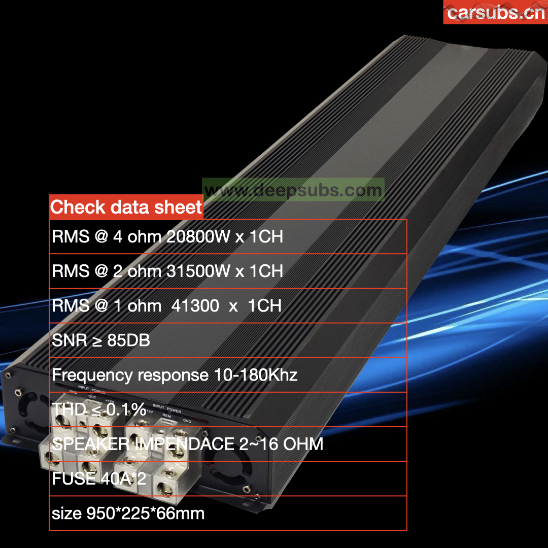 Brazilian 1 Ohm RMS 41300W Class D Car Amplifier RMS 41300W 1CH Monoblock Full Range Strong Bass Peak 40000W Monoblock Model Number F-40K1D type Class D RMS 1 ohm 41300W RMS 2 ohms 31500w RMS 4 ohms 20800W Sensitivity 400mV-3.6V Frequency response 10-180khz Product Size 950*225*66mm