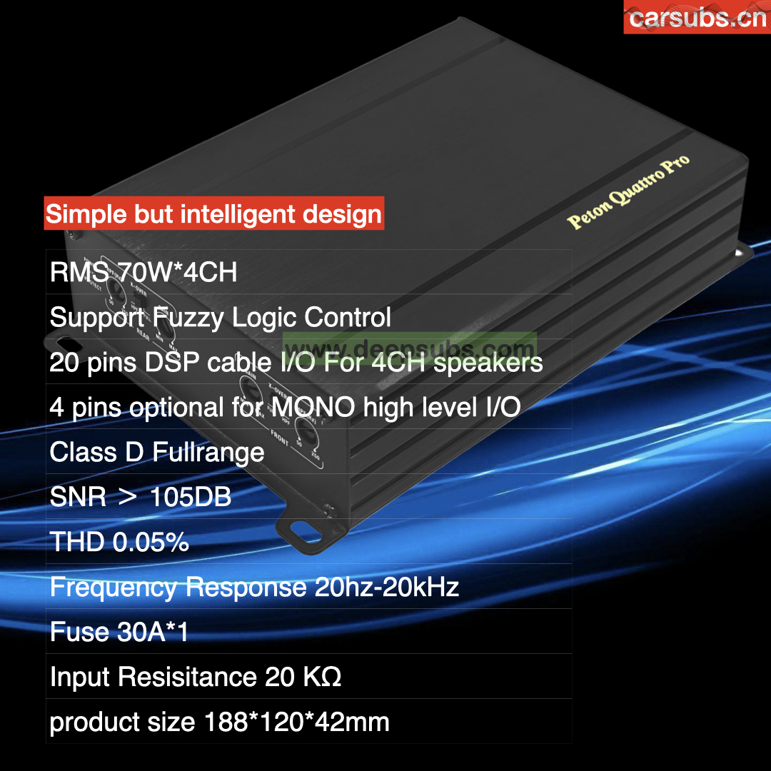 Sound Quality Car Android Speakers Amplifier RMS 70W 4 Channels Peak 3000W Car Amplifier Class D Model Number SA-PQP704D type Class D RMS 4 ohms 70W 4CH Feature Build in Fuzzy Logic control DPS input/ouput 20pins T.H.D 0.05% Frequency response 10-30k hz Fuse 30A*1
